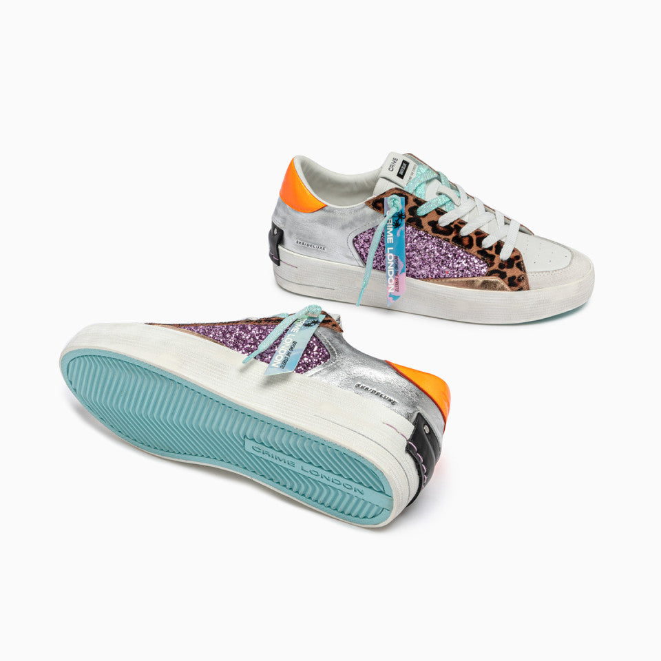 - Silver laminated leather upper with purple glitter and leo print calf leather, gold laminated leather details