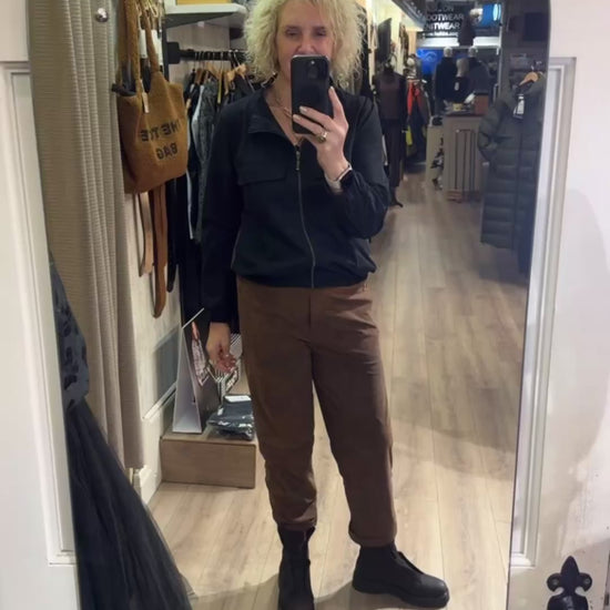 IThe Jane Lushka Daphne Pants in brown combine sophistication with comfort. Made from soft technical jersey with a suede-like finish, they feature a sleek, modern cut with cropped tapered legs and a flexible waistband. The turned-up hems add subtle elegance, making these pants a versatile choice for both polished and casual looks.