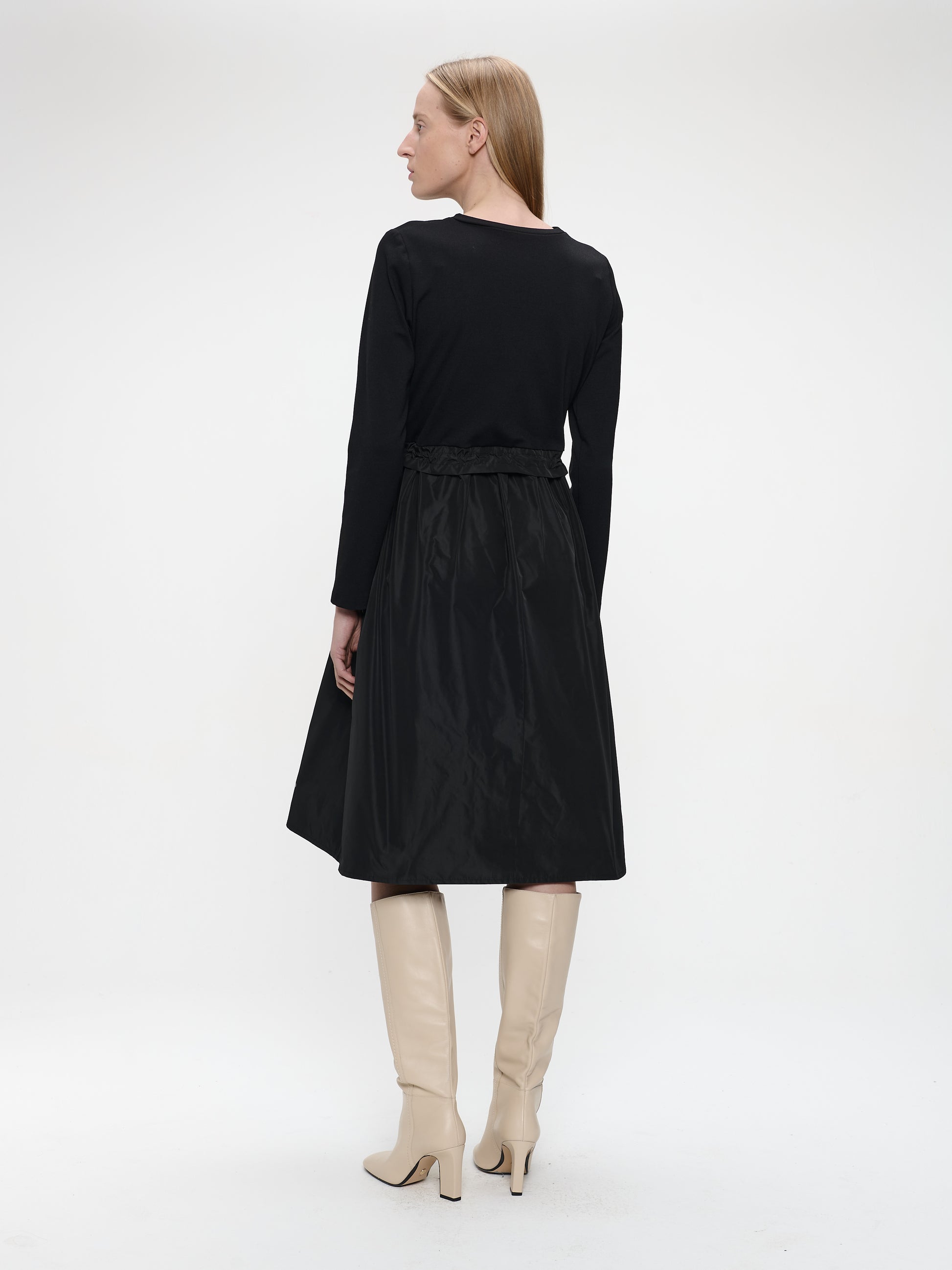 Blending texture and structure, the Ester Mix Cotton Taffeta Dress offers a fresh take on daywear. The upper part features a soft viscose-blend jersey, while the skirt is crafted from lightweight taffeta that adds subtle volume and sheen. A braided waistband and tonal chest pocket complete the look — stylish and effortless for both casual outings and polished settings.