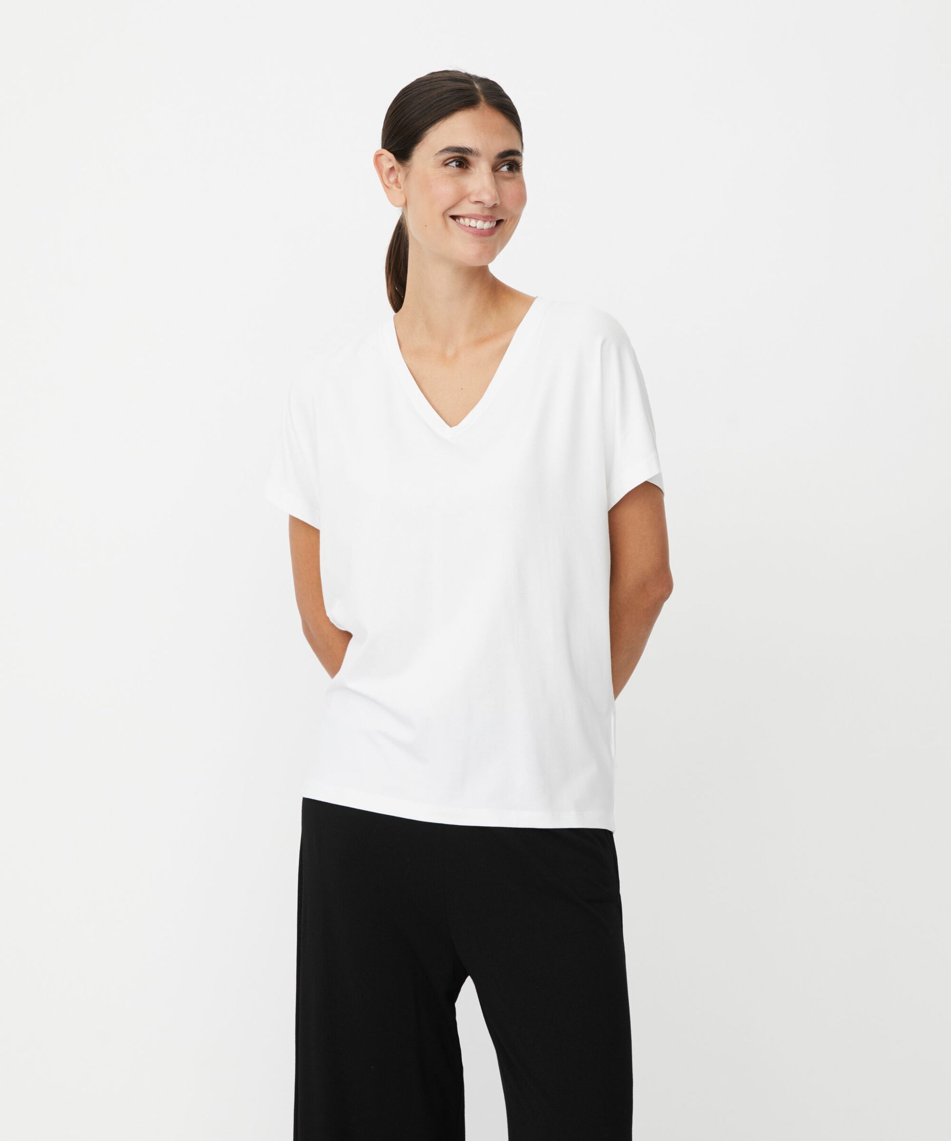An essential basic for your wardrobe – simple, soft, and versatile. The T-shirt is crafted from super soft jersey with a classic, straight cut that drapes beautifully over the body. Featuring a feminine V-neck and short sleeves, the T-shirt gracefully drapes over the shoulders. Perfect every season with jeans, skirts, and layered looks. A stylish everyday favourite you’ll love to wear time and again.