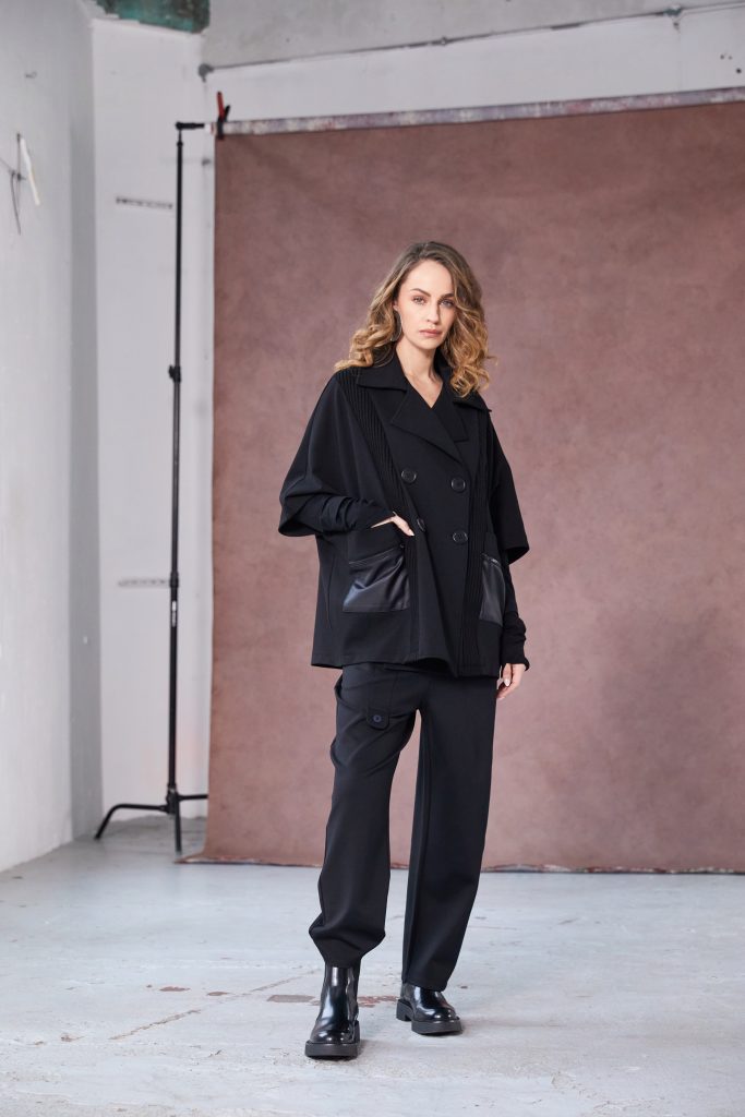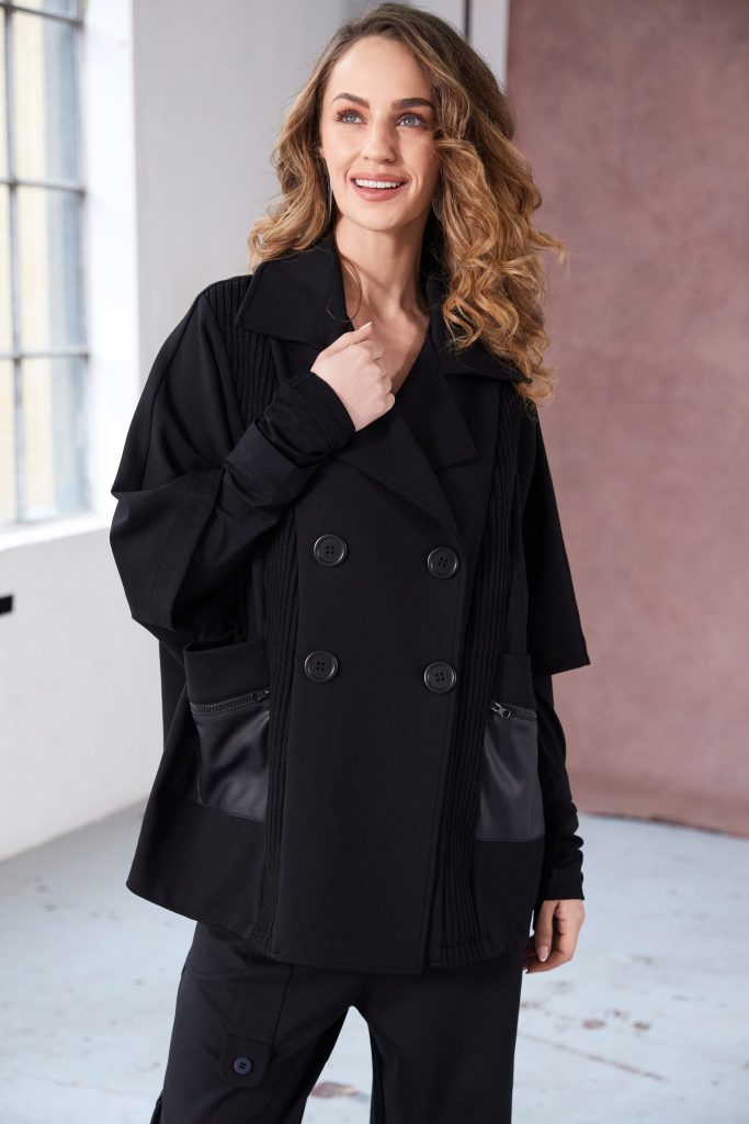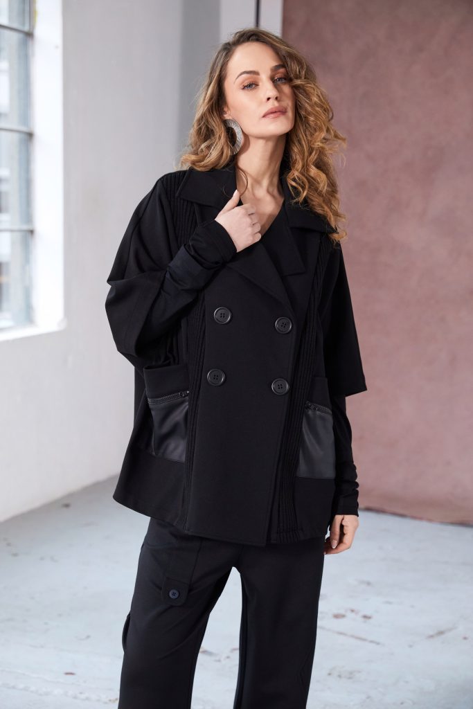 The NAYA revere collared jersey jacket is double breasted with self coloured oversized buttons. Together with vertical ribbed knit panels and dropped shoulders that finish in cap like sleeves make it a strong contender for favourite piece of the season.