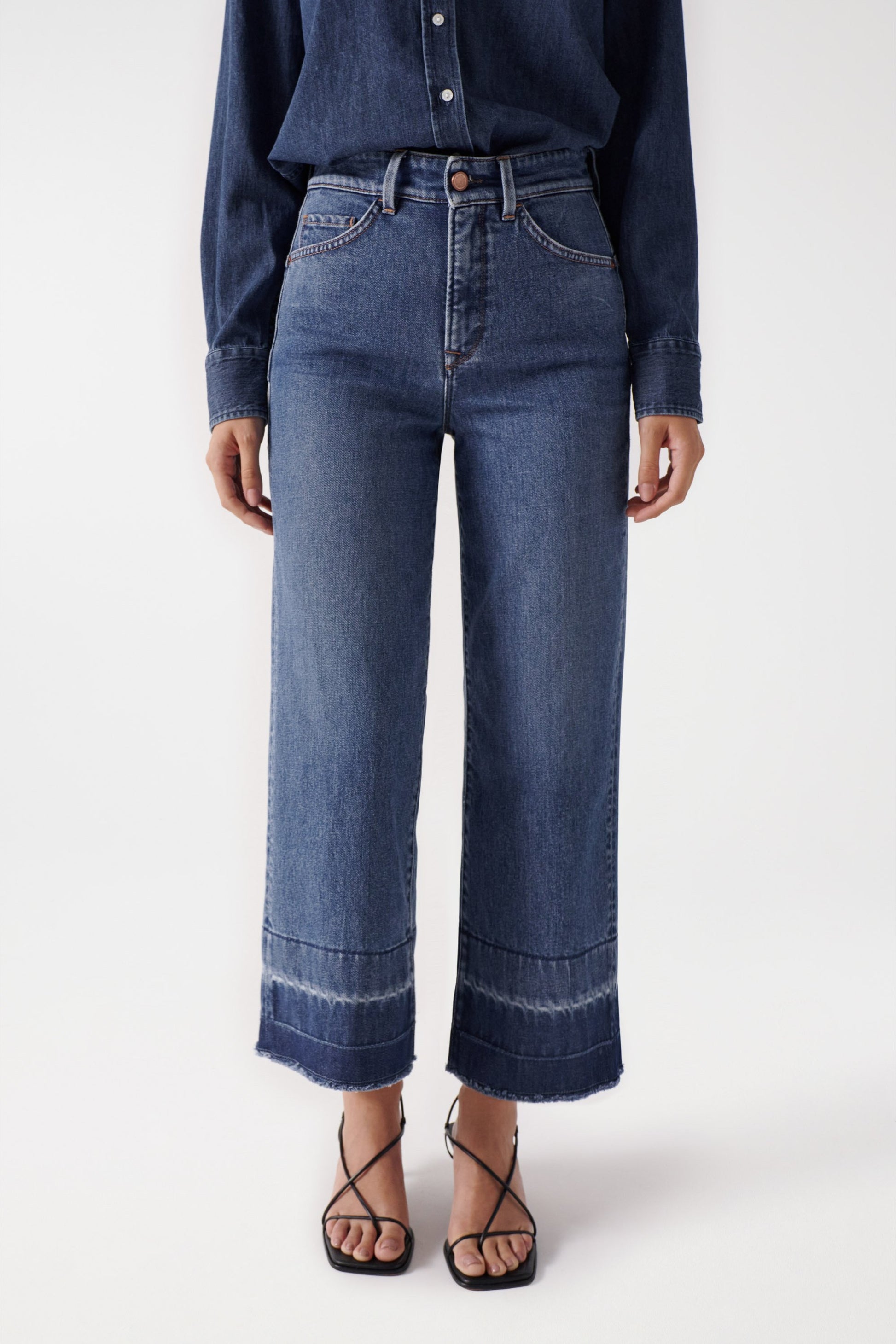 Faith Push In jeans. Cropped straight leg. Blue. High rise. Zip fly with button. Belt loops. Five pockets. Degradé effect and undone hem.