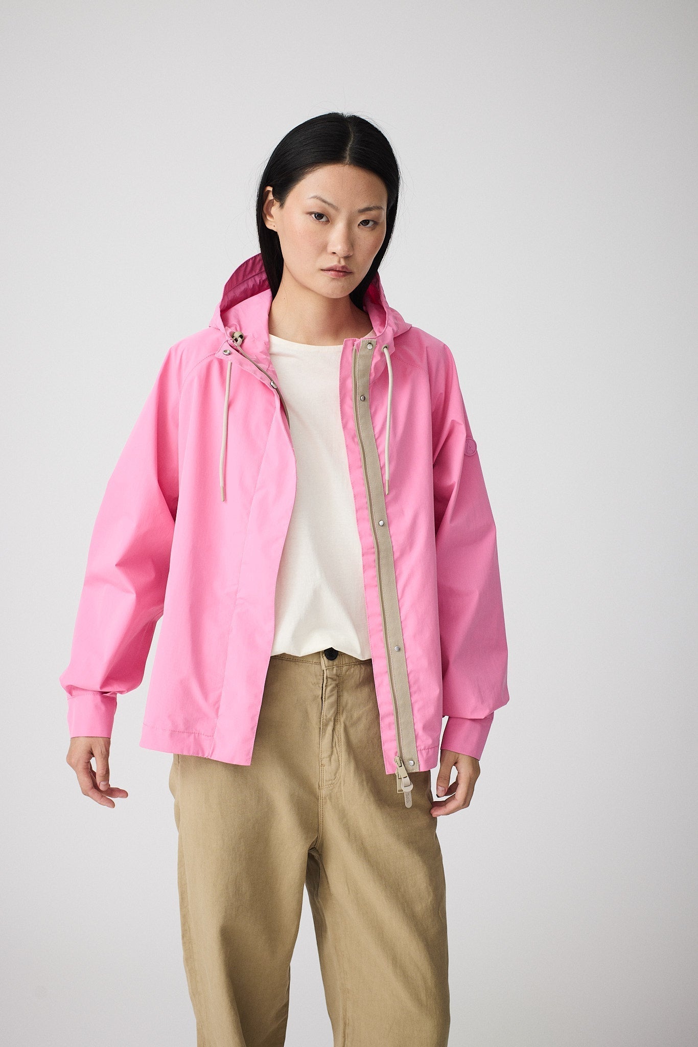 The Dhuda Waterproof Jacket is a short, loose-fitting style crafted from a waterproof cotton-blend fabric. This timeless material is both breathable and windproof. Design details include taped seams, raglan sleeves, a double-slider zipper, and concealed snap closures. Its sleek A-line silhouette is finished with rounded side slits for a feminine touch.